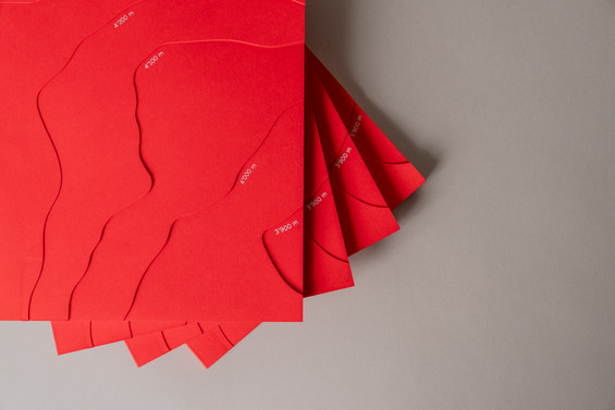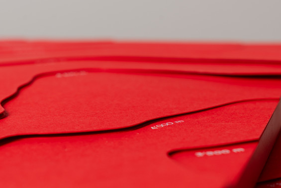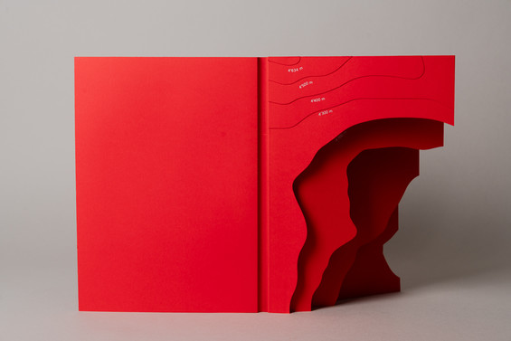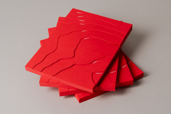Durch die Treppen-Stanzung entsteht auf dem Flatbook open ein Relief, welches die Kontur der Höhenlinien der Dufourspitze aufgreift. Die visuelle Abfolge beginnt auf 3’900 Metern über Meer und führt Ebene für Ebene bis zum Gipfel auf 4’634 Metern. Denn nicht in grossen Schritten, sondern Ebene für Ebene wird ein Berg erklommen…