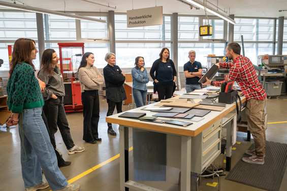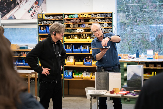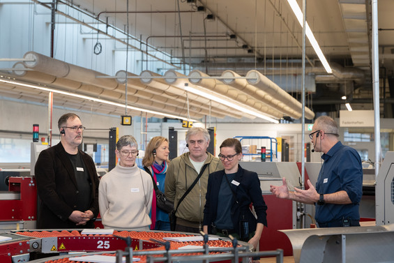 Bei der Erlebnis-Führung mit Thomas durch die laufende Produktion war die hochwertige Folienprägung, Farbiges zur sichtbaren Fadenheftung und das Registerstanzen im Fokus.