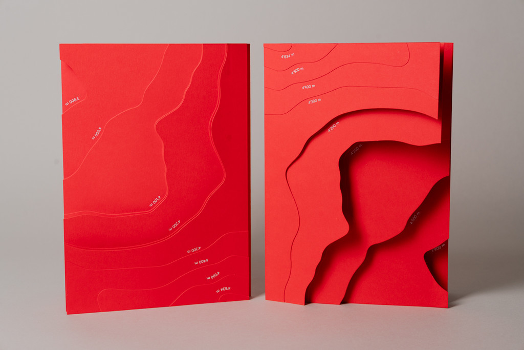 The staircase embossing on the Flatbook open creates a relief that echoes the contour lines of the Dufourspitze. The visual sequence begins at 3,900 metres above sea level and leads level by level to the summit at 4,634 metres. Because a mountain is climbed not in big steps, but level by level...