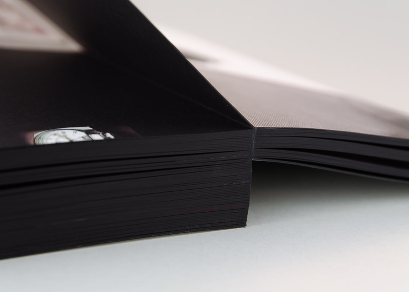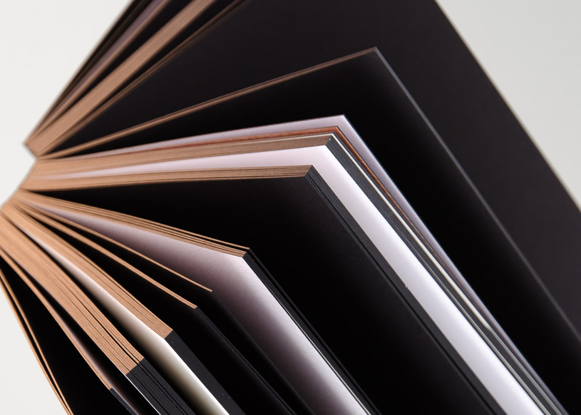Bei diesem Flatbook mit offenem Rücken wurde nebst dem Zusammenkaschieren der Inhaltsseiten ein Deck- und Schlussblatt manuell aufkaschiert. Deshalb ist der Rücken sichtbar und das Gesamtprodukt lässt sich perfekt öffnen. Das Flatbook weisst zudem einen dreiseitigen Farbschnitt auf.