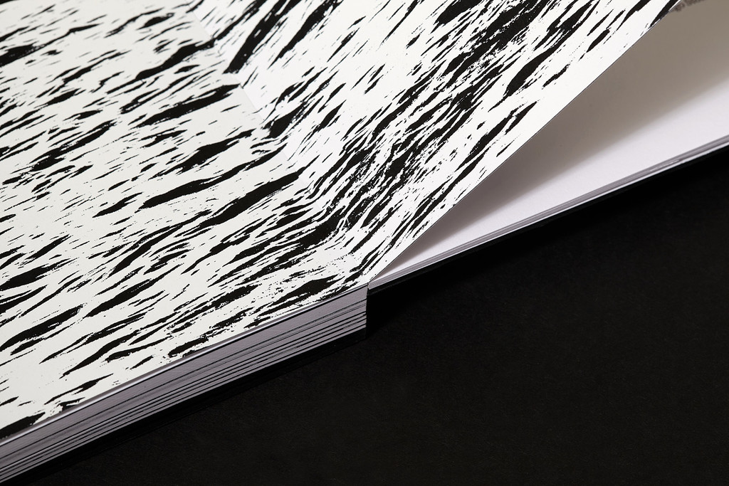 Deckblätter Pergrafica Infinity Black 200 g/m². Inhalt Daunendruck white 1,5 200 g/m² und Papyrus Fuego Stone, coal black 200 g/m². Deckkarton Alpha Black Core 2.0 mm. Siebdruck Weiss bzw. 4-farbig.