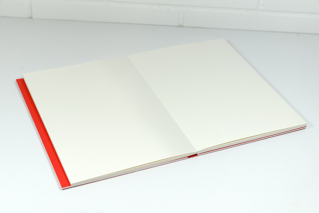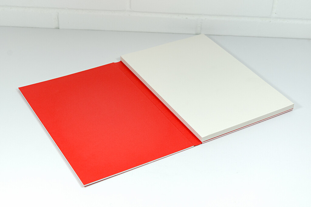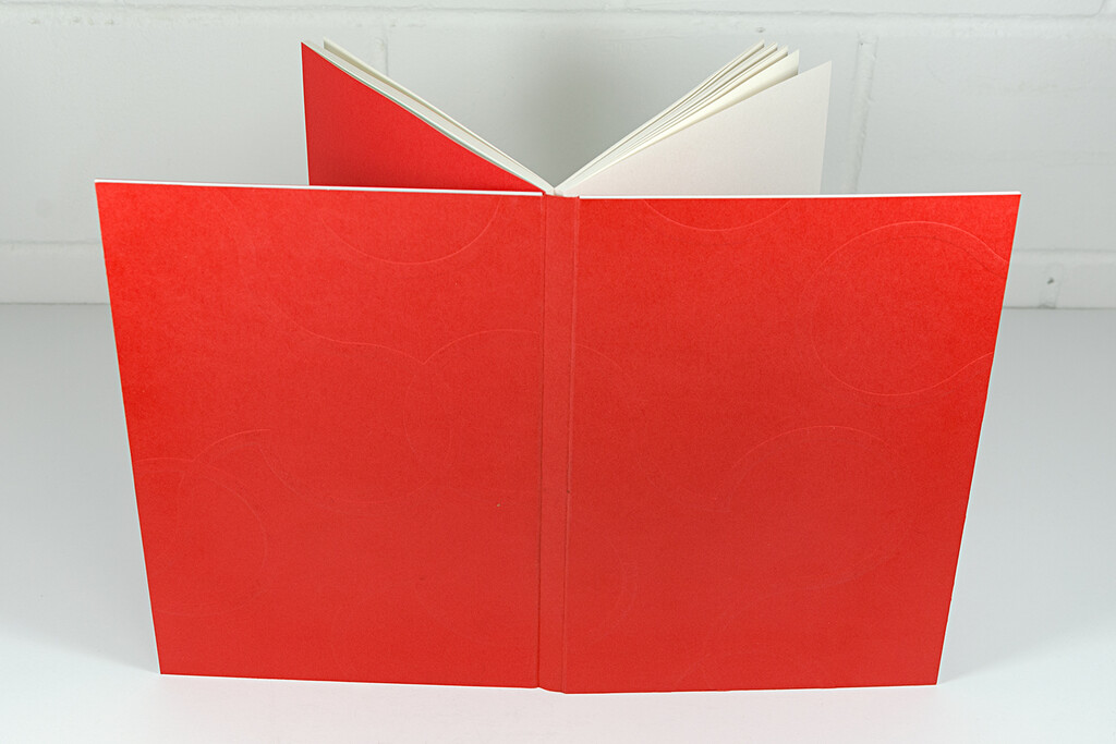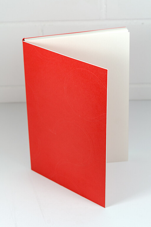 Überzug und Spiegel Kaskad 120 g/m² korallenrot, Vorsatz Kaskad 225 g/m2 korallenrot, Inhalt Werkdruck 90 g/m2 voluminös, Deckel 2 mm Alpha core white, Blindprägung.