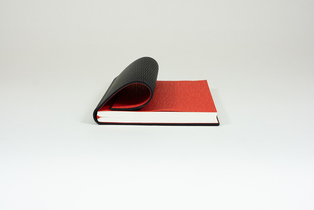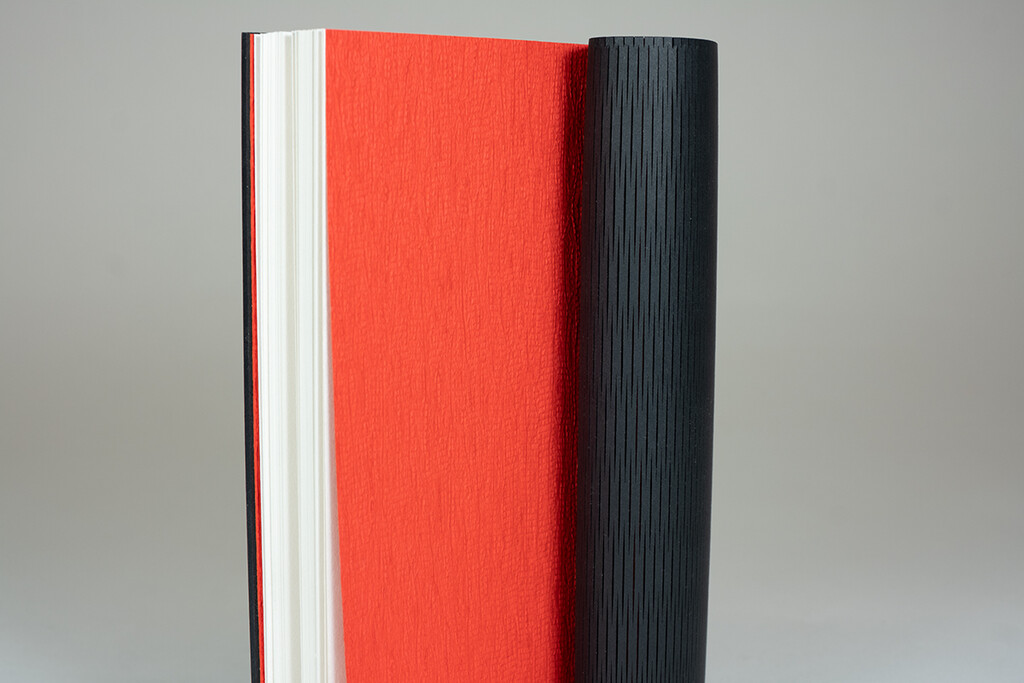 Decke Alpha BlackCore 2.0 mm, Vorsatz Krepppapier rot 130 g/m2, Inhalt Werkdruck 1.8 Volumen elfenbein 90 g/m2 g/m², Fadenfarbe rot, Zeichenband rot, Rücken rund, Laserstanzung