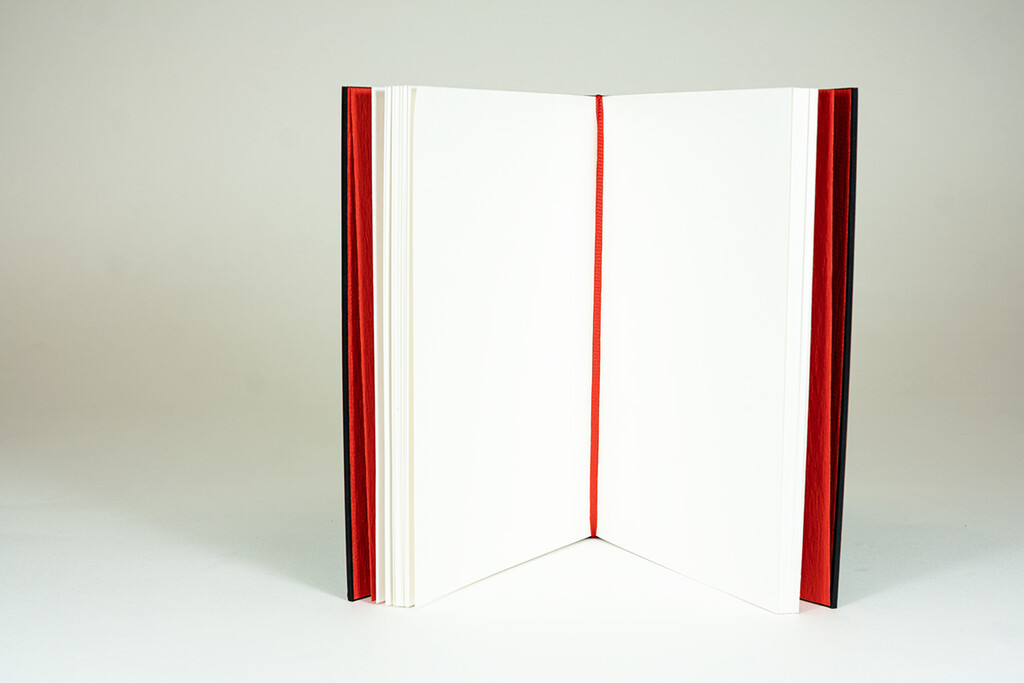 Maschinelle Fertigung des Inhaltblocks in Fadenheftung inklusive rotem Rückenfälzel und 3-seitigem Fertigschnitt. Laserstanzung der Decke. Maschinelles Einhängen vom Inhalt in die Decke mit schmalen Kanten.