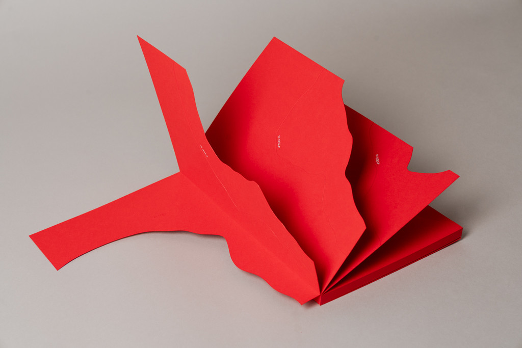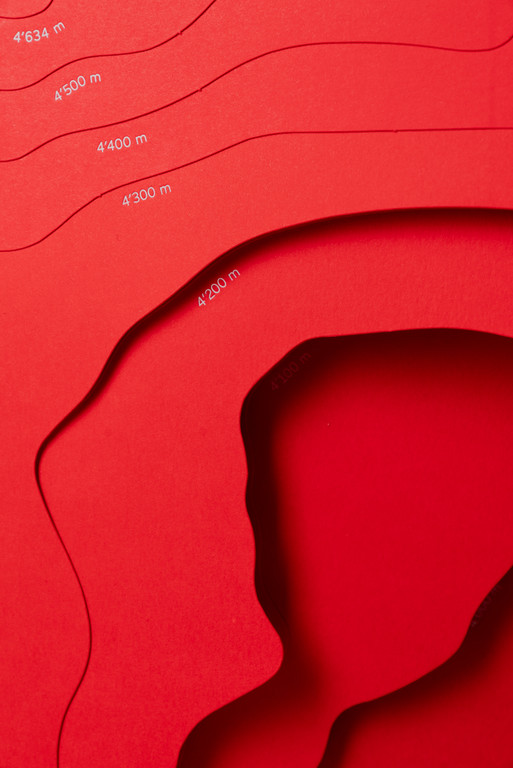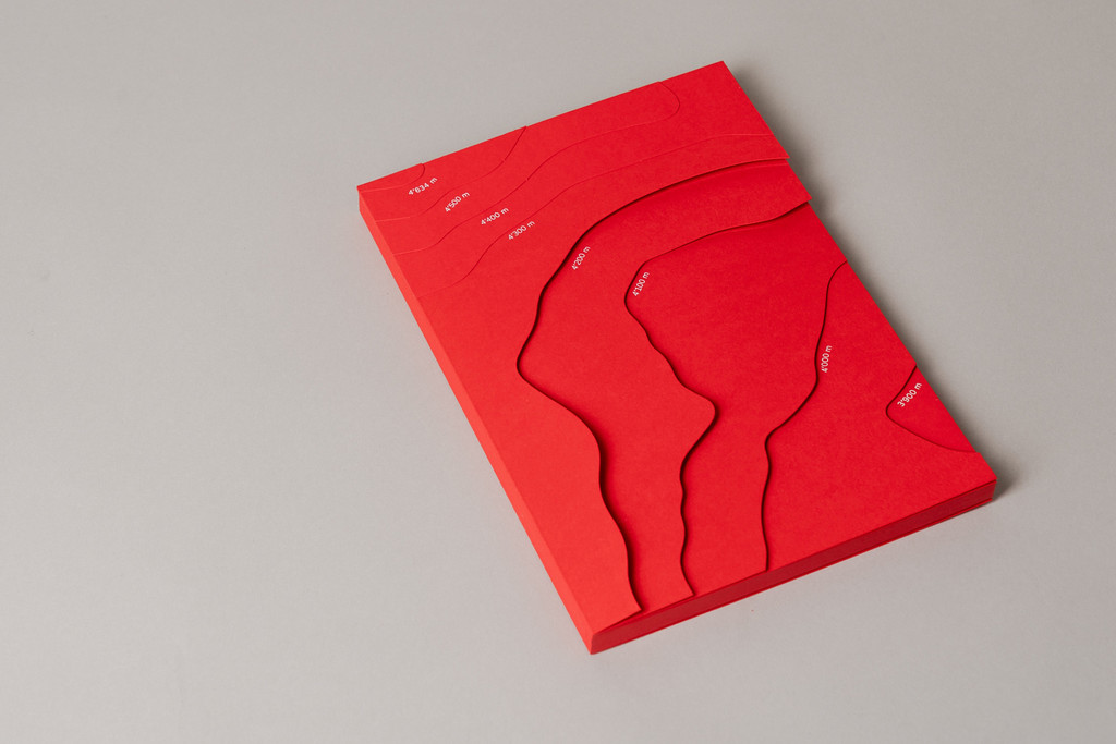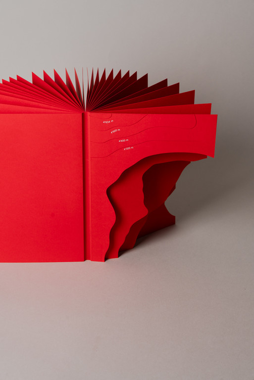 Flatbook-Bindung mit Treppen-Stanzung. Die aus drei verschiedenen Flächengewichten bestehenden Materialebenen wurden teils maschinell und teils von Hand aufkaschiert. Die dadurch erlebbaren Höhenkurven sind ein Beispiel für die Synergie zwischen industrieller Effizienz und handwerklichem Geschick, die bei Bubu Programm sind. Folienprägung in weiss der Höhenangaben. Druck Impressum mit HP Indigo Weissdruck.