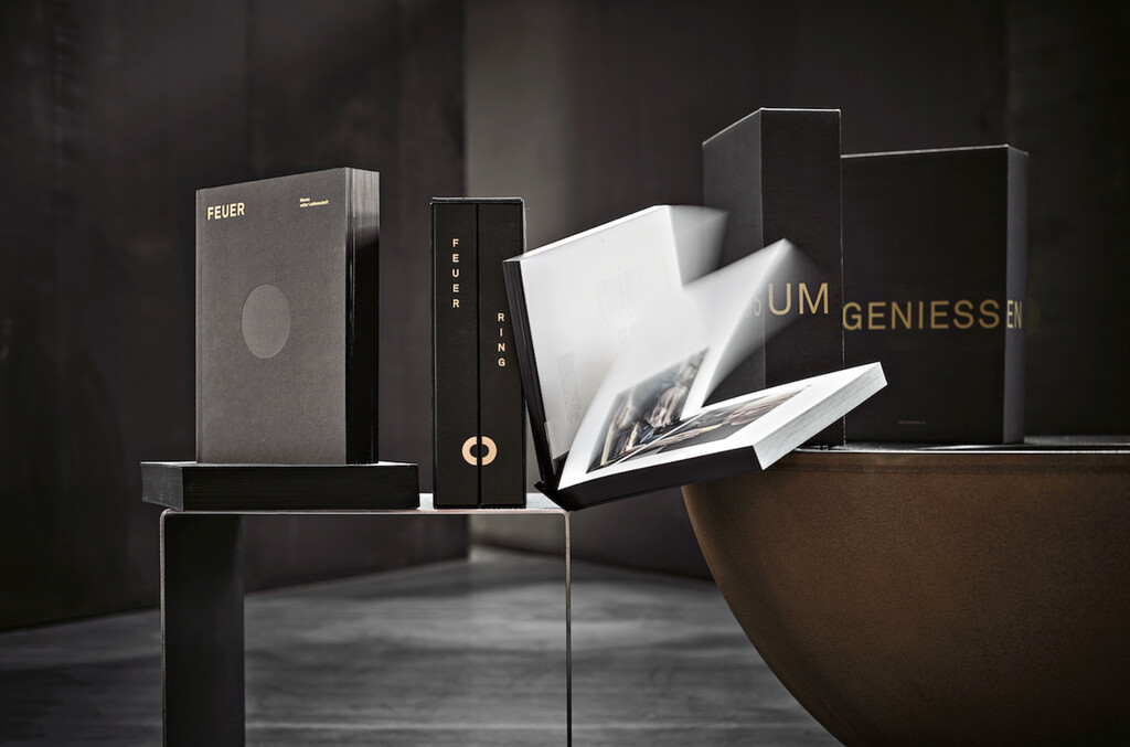Auf 292 Seiten dokumentiert «Feuer und Ring» über 70 Rezepte, Making-Of-Fotos und Wissenswertes über den Feuerring. Bei der Gestaltung des Buches wurde die besondere Ästhetik des Grills mit seiner aus Stahl gegossenen Feuerschale und den scharfen Kanten aufgegriffen: Das Ergebnis ist ein Flatbook mit durchgehenden Seiten, veredelt mit mattschwarzem Farbschnitt, Siebdruck und goldener Titelprägung, das den Anschein erweckt, als wäre es aus einem Guss gefertigt worden. Die Fertigung des Buches erforderte ein anspruchsvolles Zusammenspiel zwischen industrieller und handwerklicher Produktion.