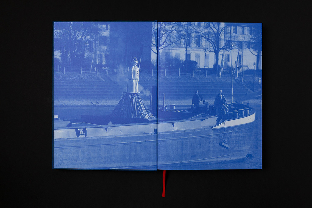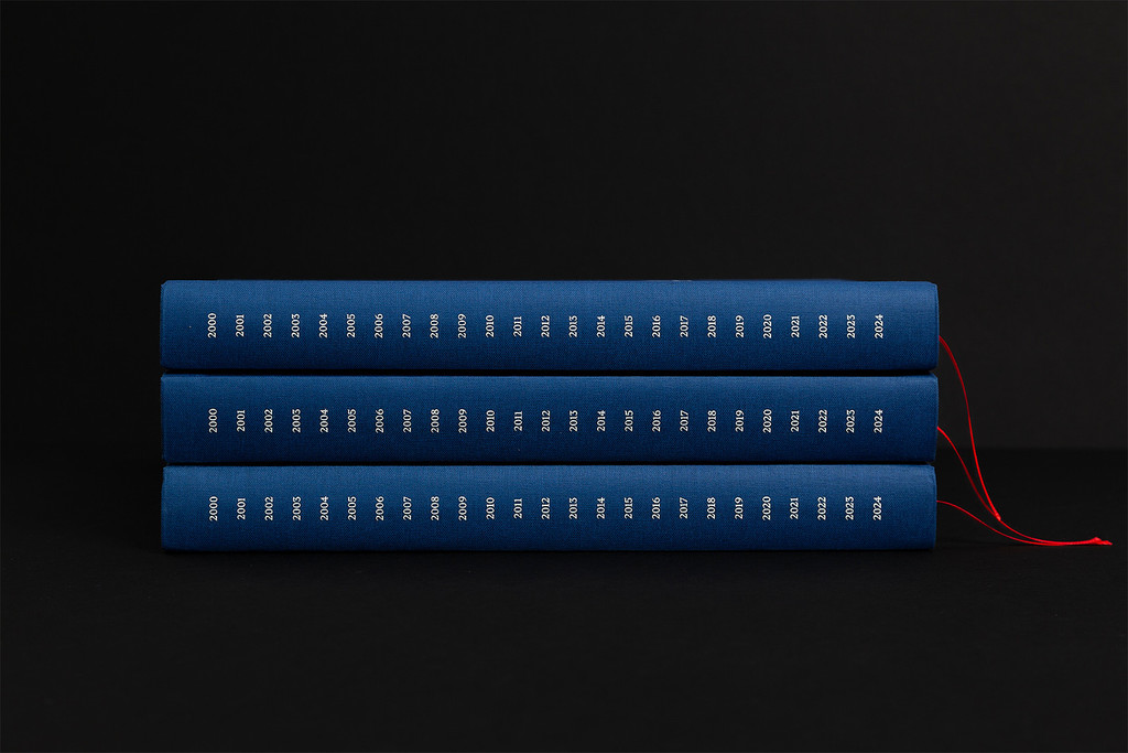 Überzug Saphir Nr. 21817 mittelblau, Vorsatz Munken Lynx Rough 170 g/m², Inhalt Munken Lynx Rough 120 g/m², Deckelkarton 2.5 mm, Fadenfarbe weiss, Kapitalband dunkelblau/weiss Nr. 02A, Zeichenband rot Nr. 463, Siebdruck weiss und rot (PMS 485U)