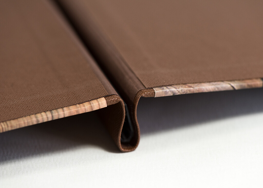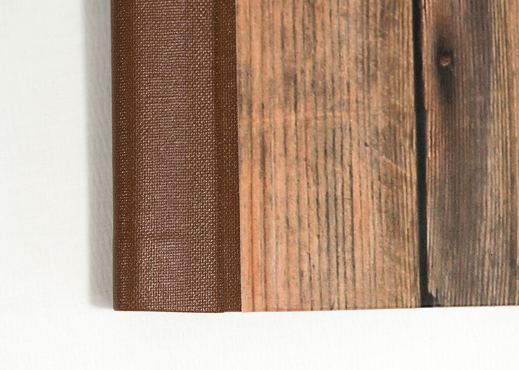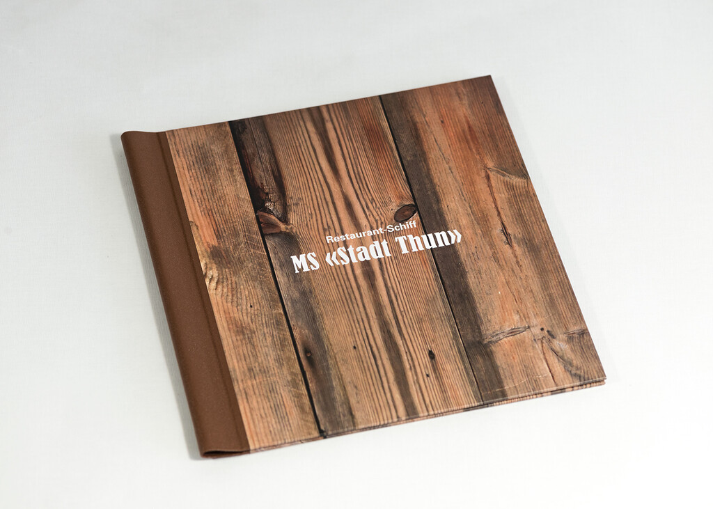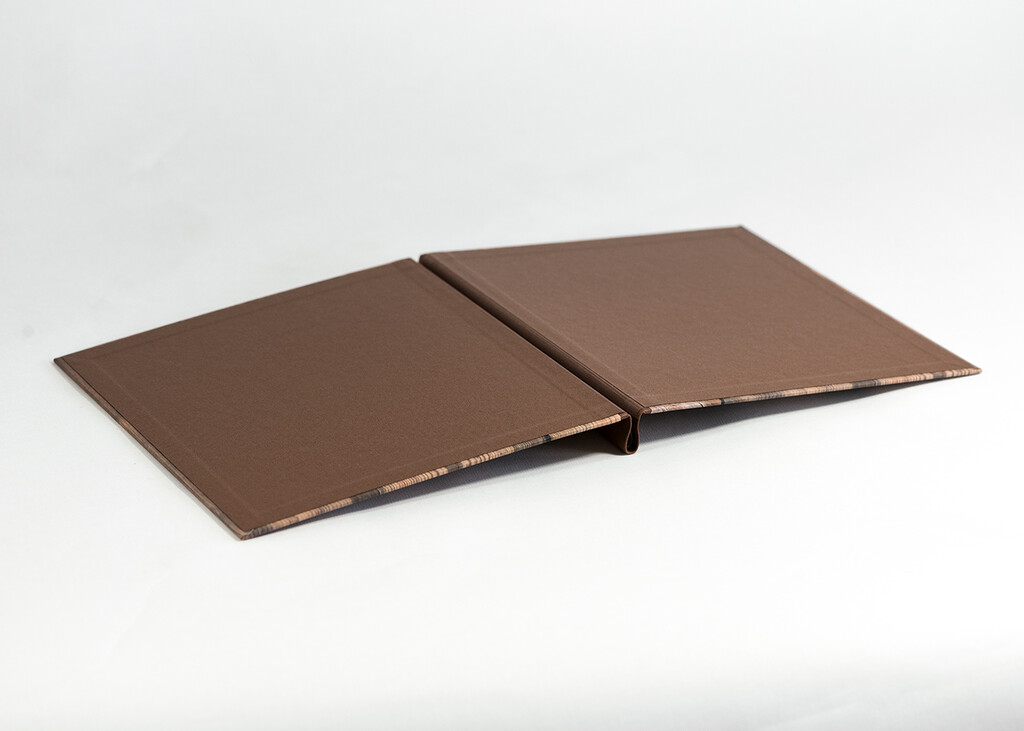 Überzug Rücken und Spiegel: Arbelave braun, Überzug Deckel: bedruckt und mattlaminiertes Papier durch Bubu, im Rücken versteckt eine Kunststoff-Klemmschiene.
